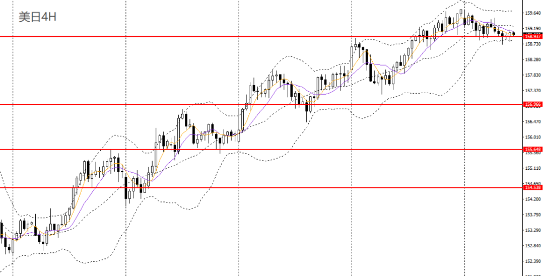 美日周二收十字星,仍徘徊于5日均线附近,日线RSI位于50之上,4小时刺破159关口,短线趋势转弱,多单建议离场,稳健者可暂时观望。