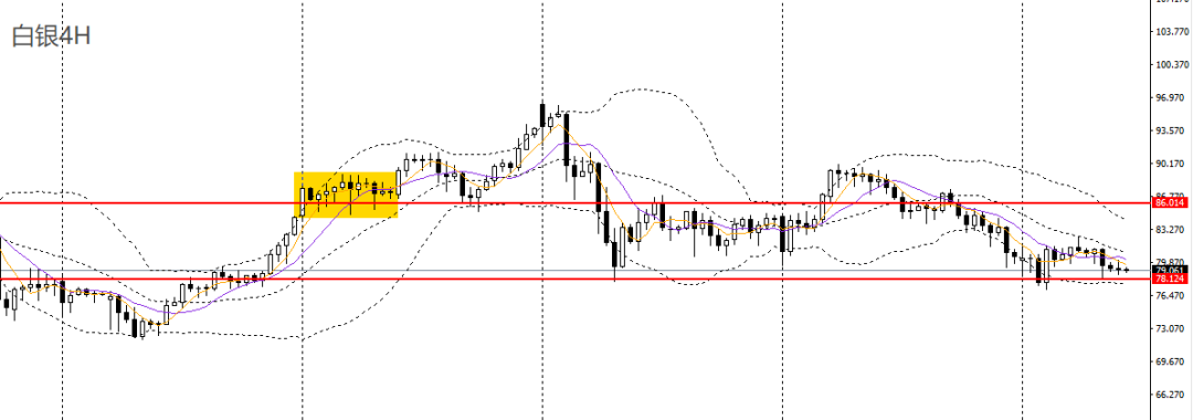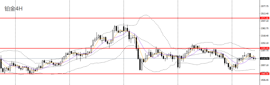铂金昨日收十字阳线,4小时多头动能放缓,仍徘徊于2000-2200区间内,在正式突破前,可延续区间高抛低吸的思路。