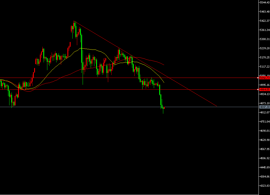 4小时图下行通道中运行。高点在下移形成下行趋势线的压制,局部在5030-5050间横盘后放量走低,破低口下移至4960附近,此位是今日的防守点,结合4小时图的放量转弱,今天会延续进一步的弱势下探,操作上结合小时图,伴随小阳线反弹后择机切入空单,亚盘反弹4870-4900分别空防守4935.5目标下看4750-4680.