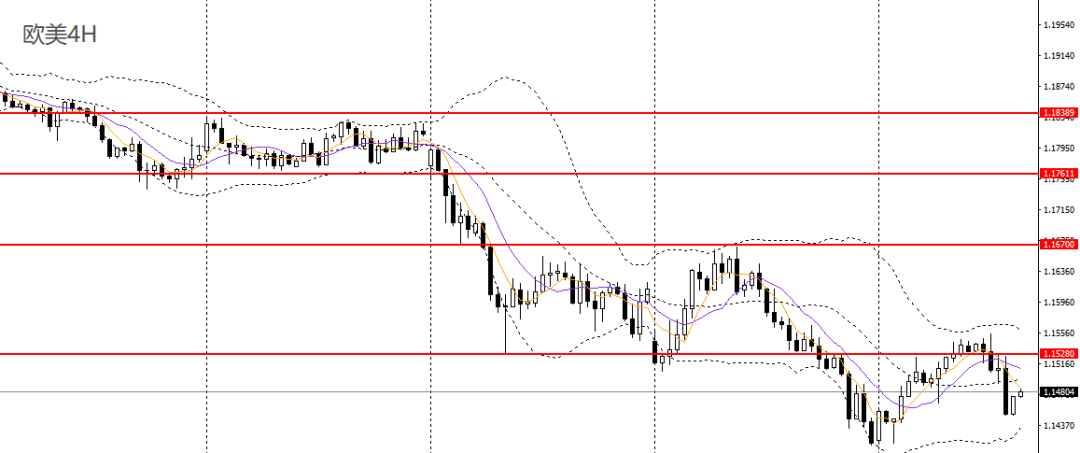 欧美昨日收看跌吞没阴柱,仍承压于10日均线,日线RSI位于低位,4小时于1.1550附近遇阻,短线整体趋势仍偏弱,后市大概率将于1.14-1.1550区间内震荡,可暂时观望。