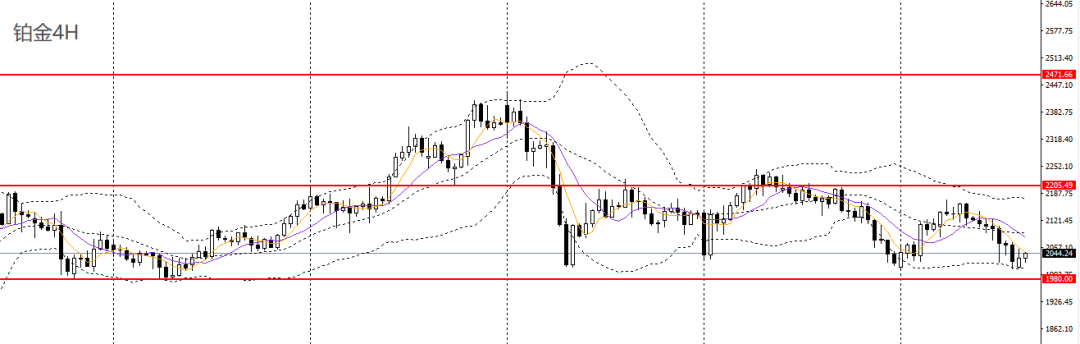 铂金昨日收长阴柱,逼近前低,4小时下探2000关口,有望下破此前震荡区间,空单仍可持有,如再度站稳,空单可离场,如彻底下破,可看空至1970。