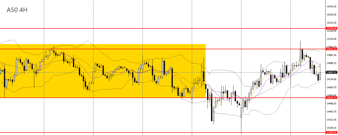 A50周三收长阴柱,回踩10日均线,4小时重回14500-15000区间,短线方向不明朗,可保持观望。