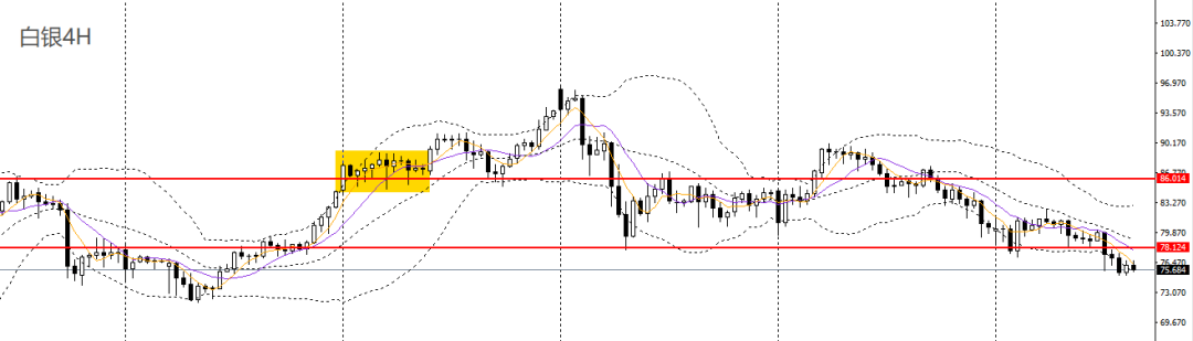 白银延续阴跌,日线RSI到达低位,4小时再度下破78附近支撑,空单仍可持有,如彻底跌破75,可看空至72。