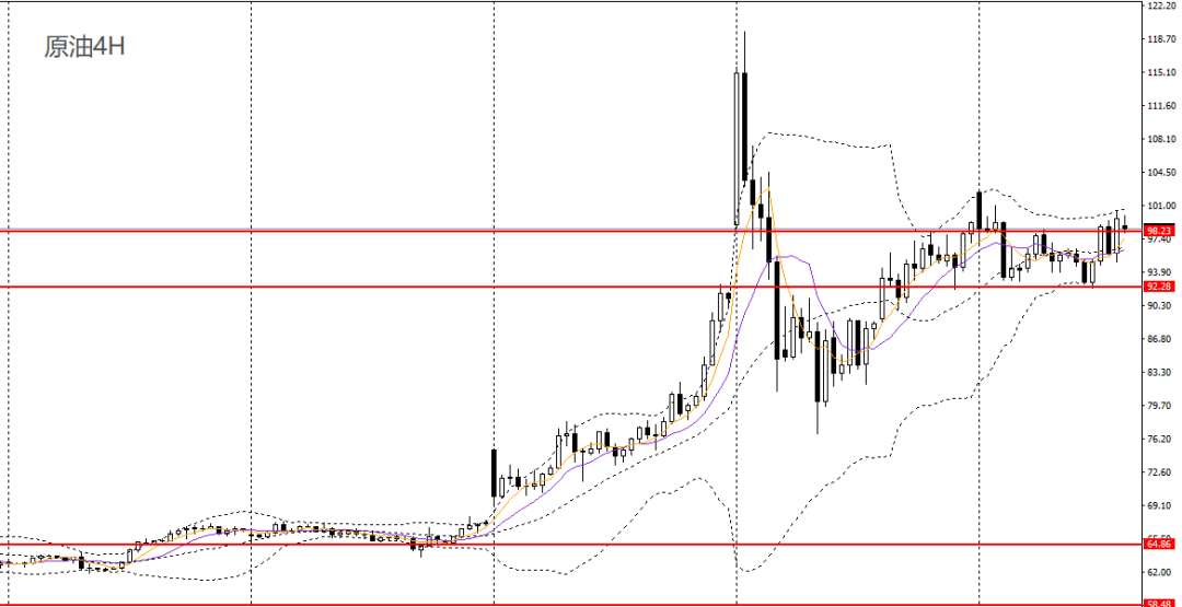 美原油昨日强势走高,日线RSI接近超买区,4小时下探92附近支撑企稳,呈双底,如维稳于98上方,多单可继续持有,后市可看多至102-104。