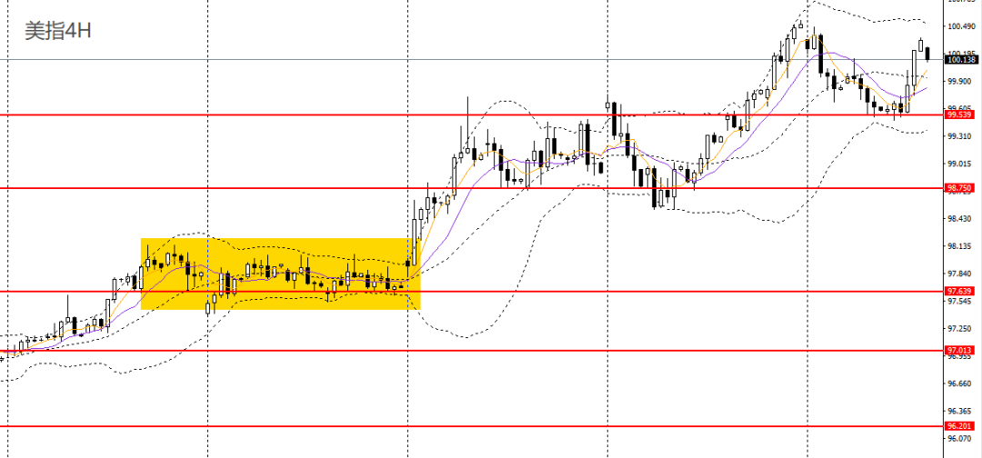 美元指数隔夜大幅拉升,重新站上5日均线,4小时触及100.30-100.50压力带,多头动能放缓,如无法升破,短线预计将维持高位震荡,如继续上破,可上看至101。