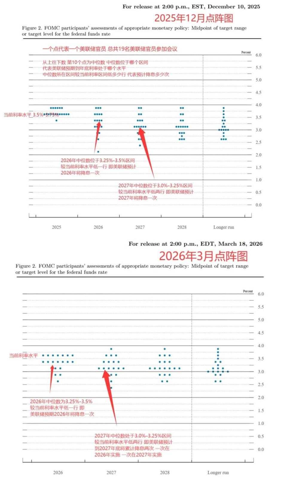 会后公布的点阵图显示,美联储决策层的近期利率路径预测和上一次去年12月公布点阵图时一致,依然预计今年、即2026年只会有一次25个基点的降息,明年也只降息一次。