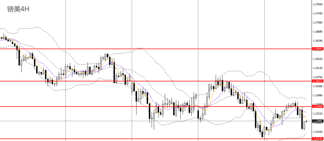 镑美周三深度下行,日线RSI仍位于50下方,4小时呈头肩顶,1.3350-1.3370一带面临强压,如无法升破,后市预计将延续震荡下行,如升破压力,短线预计将上探1.34附近。