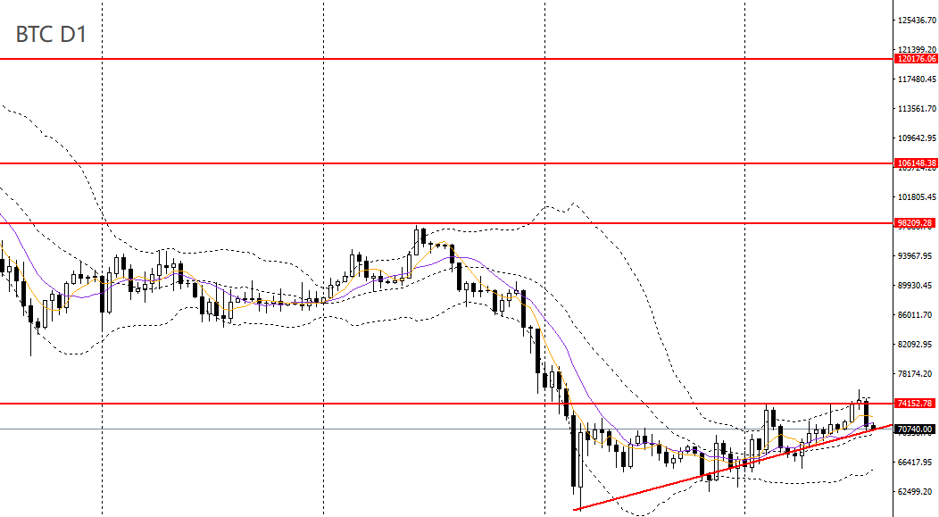 比特币昨日大幅回落,回踩上升三角下沿,日线RSI位于50附近,4小时未能有效74000一线阻力,多头力量减弱,短线预计将延续震荡。