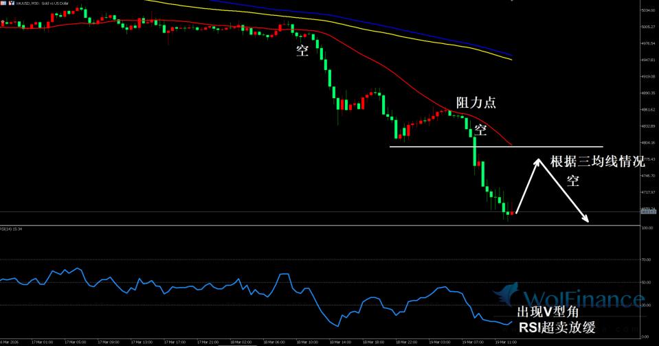 三均线入场信号判断:30 分钟周期严格跟随 4 小时大周期空头趋势,当前 K 线价格已明确跌破前低支撑点,且整体处于三均线看空区间,红色 31 均线下穿黄、蓝均线形成空头共振,短线空头趋势明确;结合图表标注信号,4700-4720 美元为前低破位后的关键反压阻力点,同时与 30 分钟红色 31 均线、黄色 144 均线形成共振阻力,是本轮反弹的核心做空点位,图表明确提示根据三均线情况布局空单,美盘时段反弹到位后依旧延续空头下行。RSI 指标辅助:30 分钟 RSI 处于深度超卖区间,出现V型角超卖放缓,反映短期空头力量集中释放,大概率触发小幅技术性反弹;需等待金价反弹至阻力区间,且出现承压回落信号后,再顺势入场做空,切勿盲目低位追空。