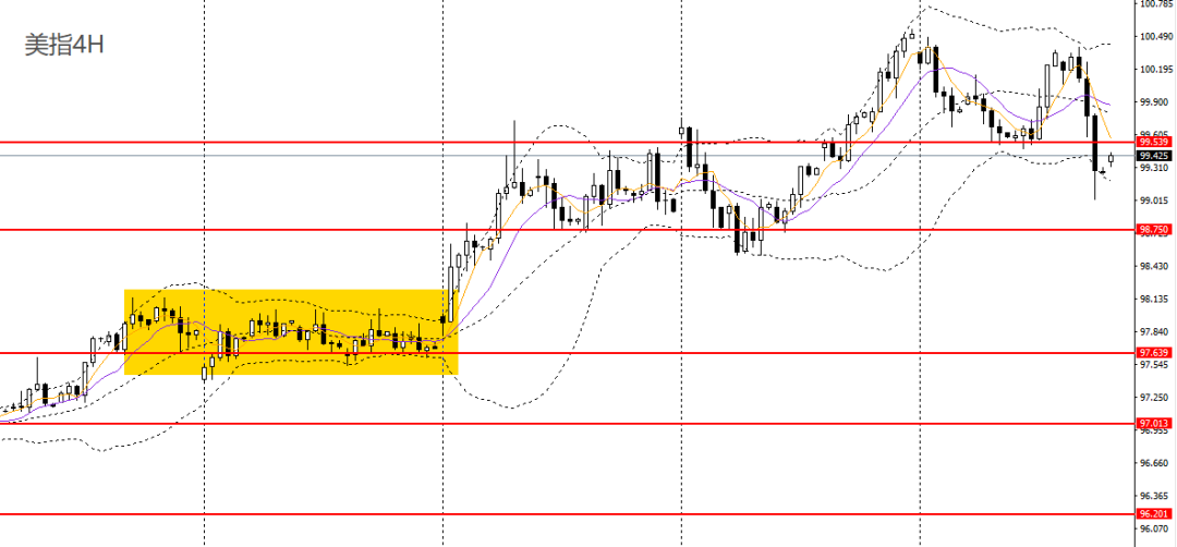 美元指数深度回落,4小时下破99.50一线支撑,且回踩99关口,短线趋势转弱,后市预计将于98.70-99.70一带震荡。