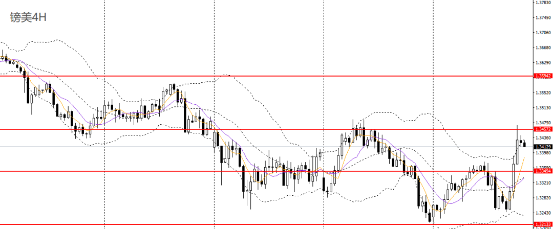 镑美周四大举上攻,日线RSI位于50左右,4小时上探1.3450-1.3470一带压力,短线走势极为强劲,1.34上方可维持低多思路。