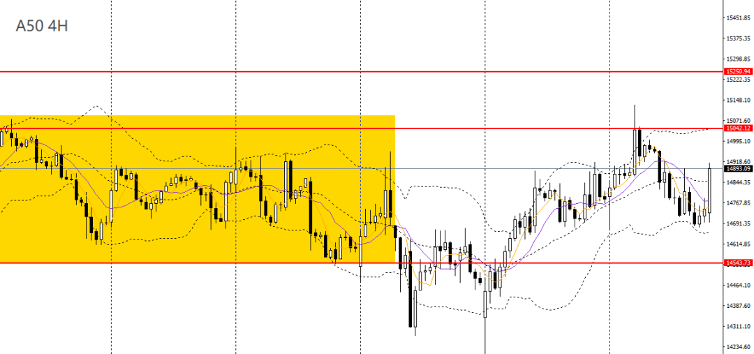 A50周四收十字阳线,升破5日均线,4小时有望重新上探15000关口,如进一步升破,可看多至15200,如无法有效升破,多单建议离场。