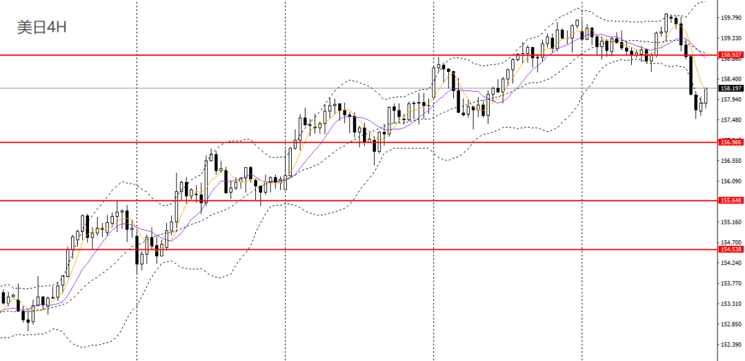 美日周四深度跳水,回踩日线布林中轨,日线呈平头顶部,4小时彻底失守159关口支撑,后市大概率将面临进一步回调,158.60附近承压可进空。