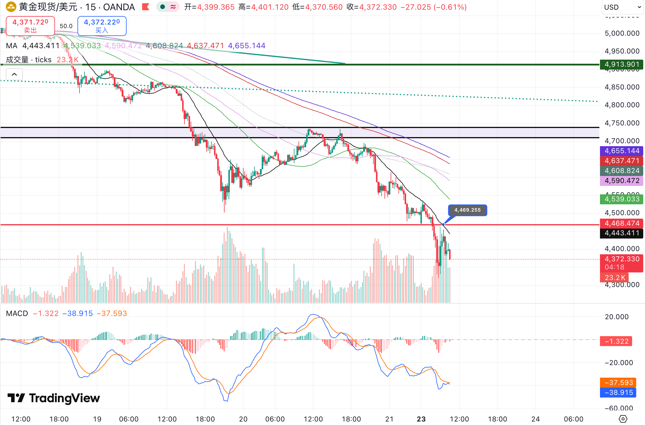短线方面,15分钟级别虽出现MACD反弹迹象,但均线压制依旧明显,MA20已下移至4444一线,而当前价格仍在4400附近运行,此时贸然参与多单风险较高,更容易陷入反弹中的回落。