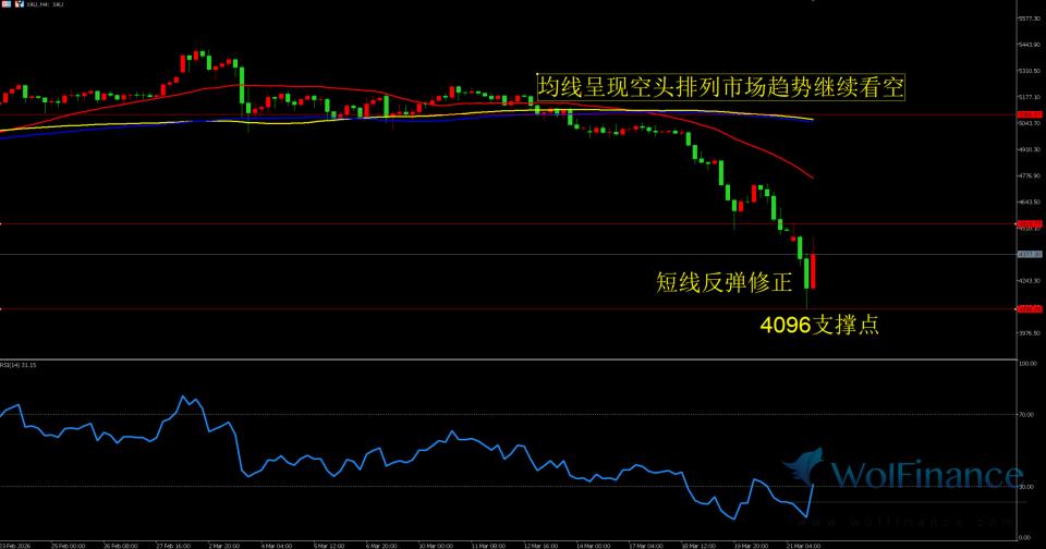 周一(03月23日)晚盘时段,现货黄金短线弱势运行,当前MT5报价4393美元/盎司,整体空头趋势主导盘面,暂无明显反转信号。基本面:上周美联储3月利率决议维持3.50%-3.75%基准利率不变,同时点阵图大幅下调2026年降息预期,全年降息次数缩减至1次甚至存在维持高利率不变的可能,鲍威尔后续讲话持续释放鹰派信号,明确表态通胀未达到调控目标绝不急于降息,意味着高利率环境将持续更久,直接提振美元指数与美债收益率维持高位运行,对无息黄金的持有价值形成持续性压制。