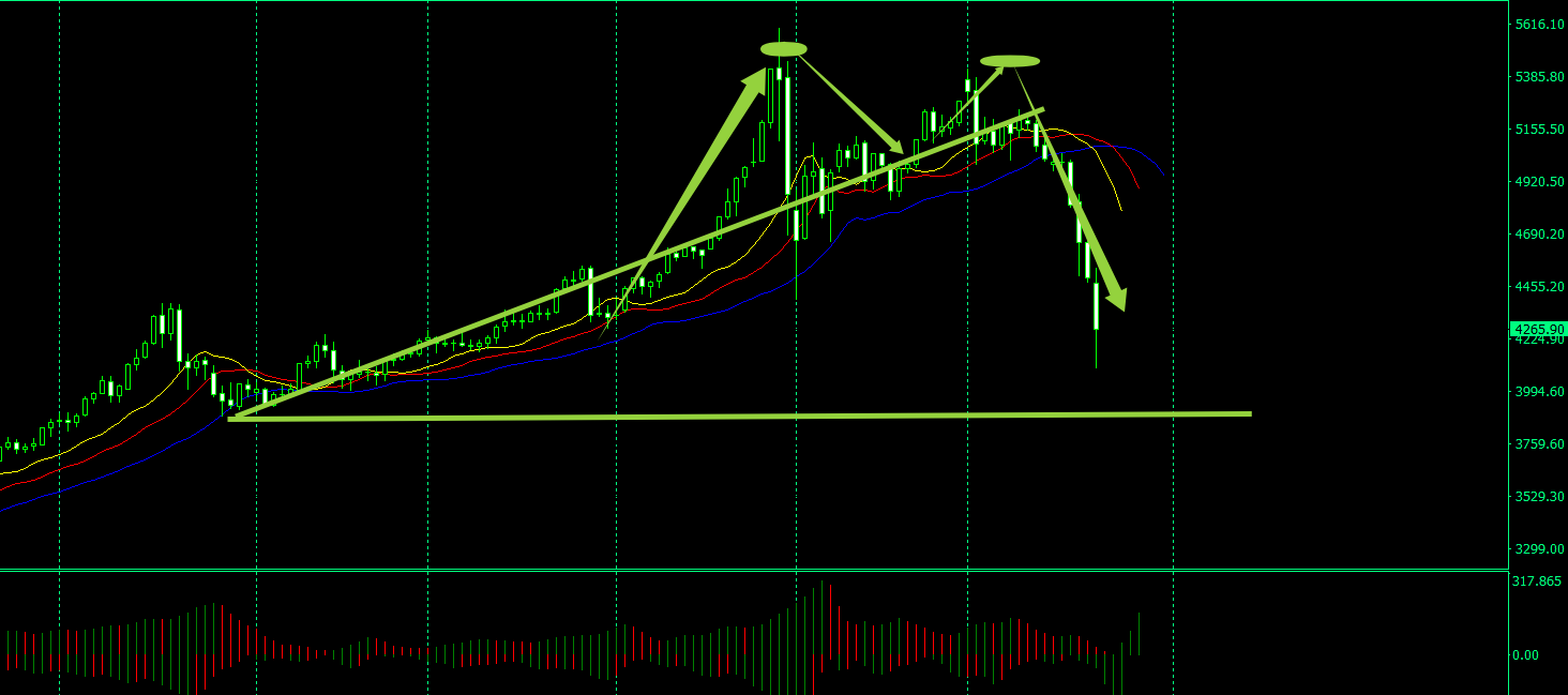 1. 双顶结构确立 (M头): 图表中两个明显的绿色椭圆圈出了历史高点区域(约5385-5400美元附近)。这是典型的“双顶”反转形态。 第二次冲高未能突破前高,且伴随成交量(下方红绿柱状图)的萎缩,确认了多头动能衰竭,是强烈的见顶信号。