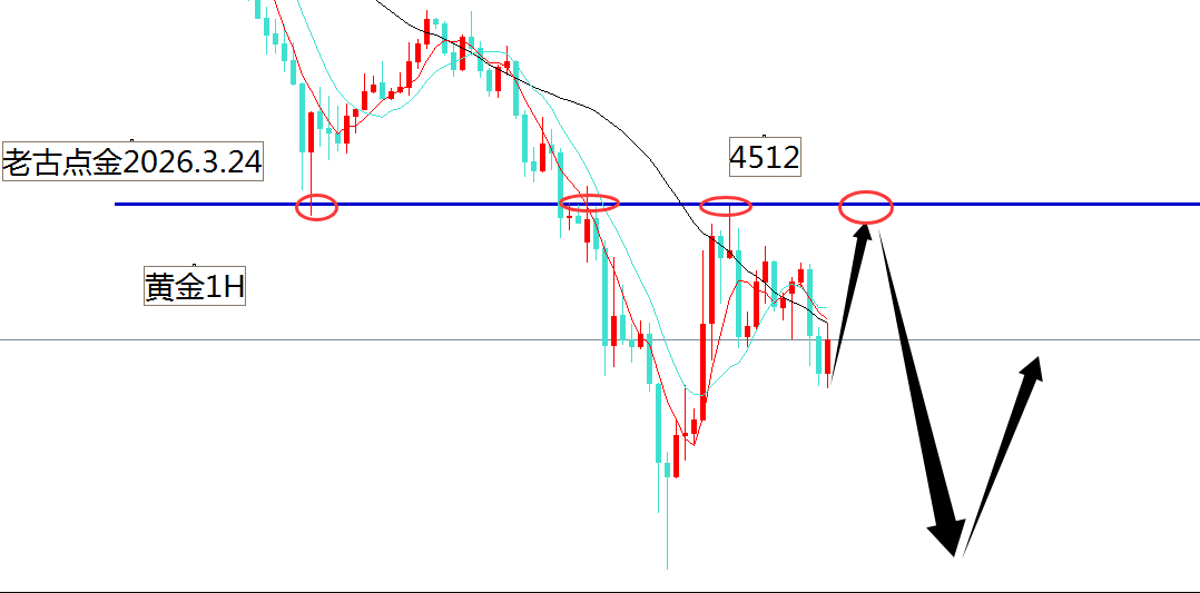 昨天的黄金行情非常刺激,白盘直接跌了400个点,最低到了4099附近,和我们预估的4000还有一步之遥,晚上黄金开始暴力拉升,直接又拉回去了最高在4512附近,昨天的黄金白盘我们布局4320追空吃肉,晚上拉升没有在空而是等待尾盘行情疲软了在4470和4443再次空吃肉,黄金最终日线收一个标准的锤子蜡烛形态,这是一个短线的止跌企稳信号,黄金和原油昨天都出现了V字行情和川普对伊朗态度转变有很大关系,消息面都是过去式需要的看未来,黄金这波大跌是否结束了?是我们关注的焦点,老古认为黄金周线级的调整还是没有结束4099还不是这波下跌的终点,老古还是看好后面破4000这个位置,不过昨天的日线信号我们需要关注多头反弹的情况。