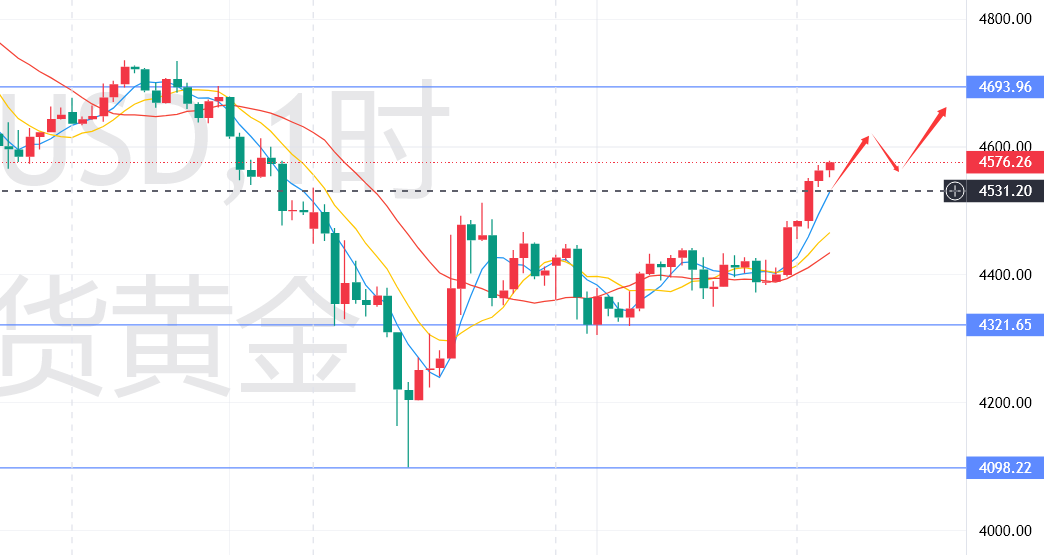 小时线级别:短期走势严格贴合四小时线上行节奏,震荡上行态势明确,运行区间逐步上移至4530-46美00元/盎司,回调幅度极小,多头动能占据绝对主导。指标方面,KDJ指标维持在强势区间运行,多空信号清晰偏向多头,无任何拐头向下迹象;MACD指标红柱保持稳定放大,DIF线与DEA线维持金叉形态,短期多头动能充足,支撑金价稳步上行。实操层面需重点关注4570美元/盎司附近突破情况,目前已接近该点位,有效突破后将打开进一步上行空间,向4590-4600美元/盎司区间靠拢;即便出现小幅回调,也属于上行过程中的正常整理,不改变整体看涨趋势,回调即是布局多单的良机,无需过度担忧。