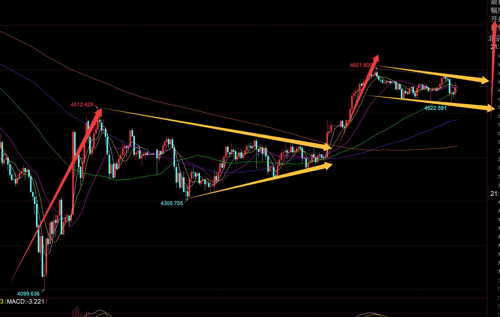 第二,黄金小时线级别:从上图可以看出,昨日是经过长时间的收敛三角,持续盘整,最终后半夜突破上拉;而今日盘整的形态大概率是震荡下行通道,由于早间是一波短期强势上冲,所以这种形态整理的结果仍会向上突破,属于上升旗形; 因此,留意通道下轨4520之上,另外今天早上一波上涨后,日内回踩了几个分割位置都有些作用,比如382位置4545, 50位置4528,都反弹了一波;所以今晚618位置4512也要关注下(也是一个顶底),只要拉低都是继续北上,在不跌破4500关口前提下,当前短期的走势还是有所偏强的,横盘下去是容易继续上破走强延续的;短线要卡相对好的位置,毕竟它决定你的防守位,位置不好是很容易刺破扫;但波段角度,不用太在意位置精准,可稍提前进行,只需降低仓位即可;
