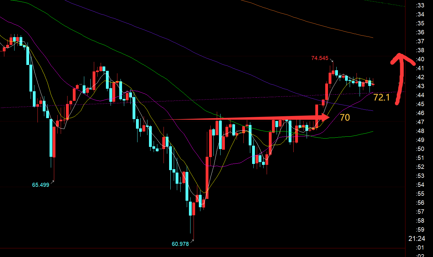 第二,白银方面:66一线也是隔夜反弹50%回踩分割支撑,企稳之后,67.5跟随看涨,也成功迎来一波不错的拉升,今日最高当前冲击74.5;惋惜的是昨夜68.5计划继续看涨,最低68.7,差一点;