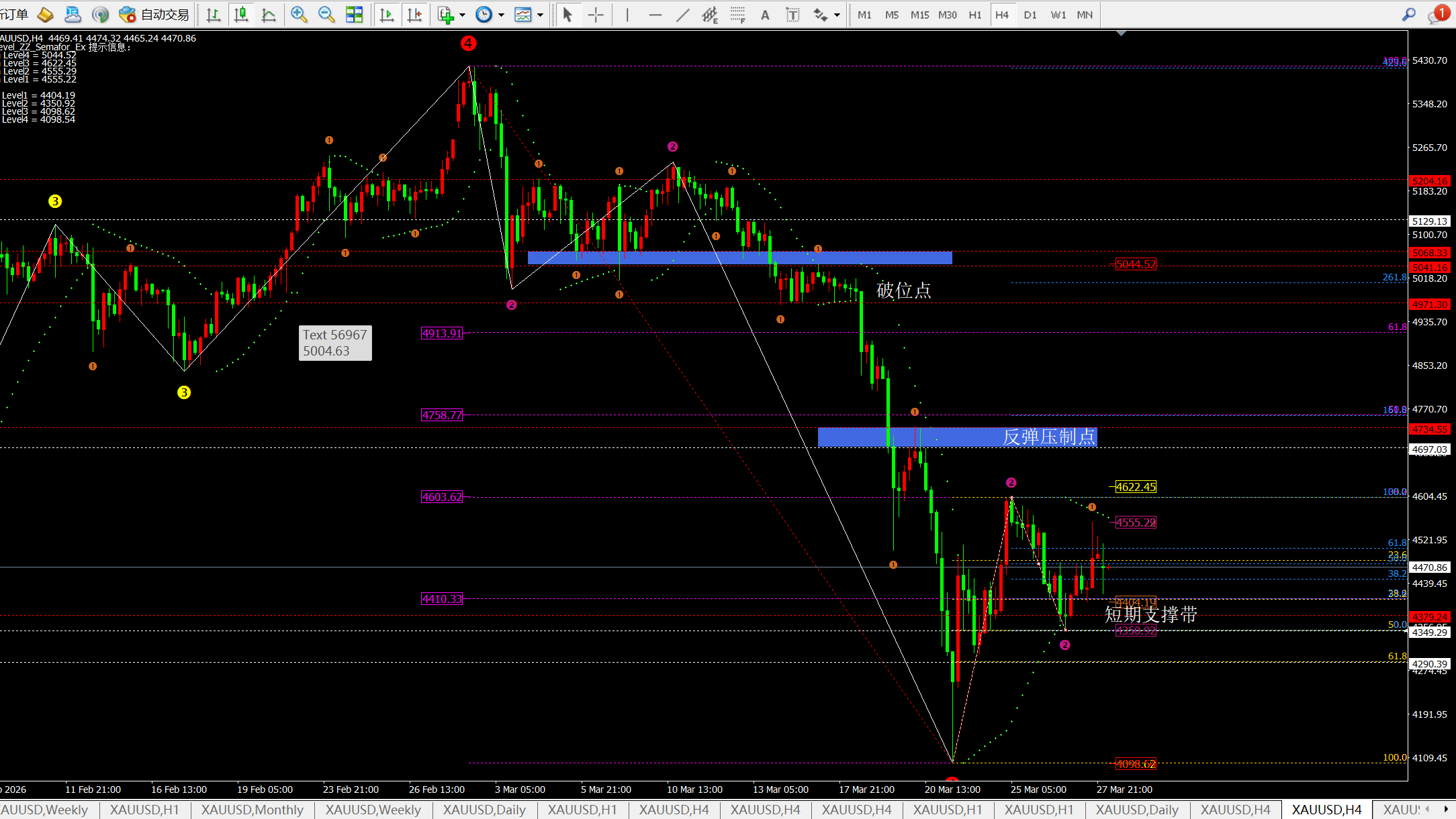 Ⅱ:价格保持低位震荡并二次下跌。所以短期均线MA10就是分水岭。低位震荡短期关注下方4575-4351-4300的支撑即可。