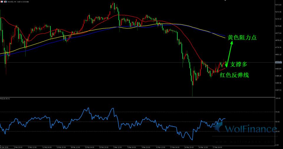 三均线趋势判断:4 小时周期下,黄金 K 线持续运行在红色 31 均线上方,红色反弹线拐头向上,构成短线反弹生命线;黄色 144 均线与蓝色 165 均线仍处于下行趋势,图表标注 “黄色阻力点”,明确当前走势属于下跌后的技术性修复。RSI 指标辅助:4 小时 RSI 指标报 56.41,处于 50 上方强势区间,多头动能充足,反弹趋势暂未结束。