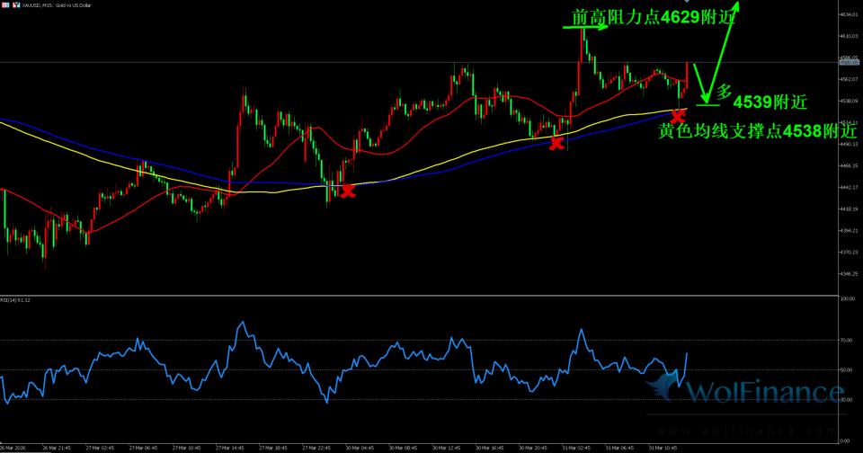 周二(03 月 31 日)美盘前时段,现货黄金延续反弹走势,当前 MT5 报价 4539 美元 / 盎司。盘面站稳红色反弹线与黄色均线支撑上方,短线多头趋势明确,正冲击黄色阻力点,