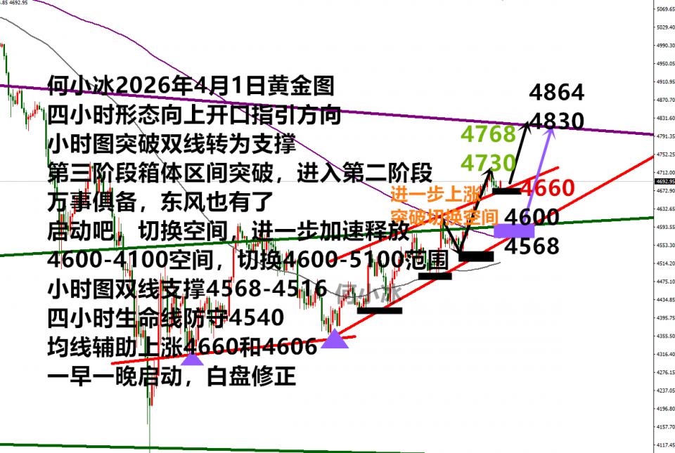 第二是四小时形态开口指引向上的方向,4660之上强势上涨,4600之上扫荡上涨