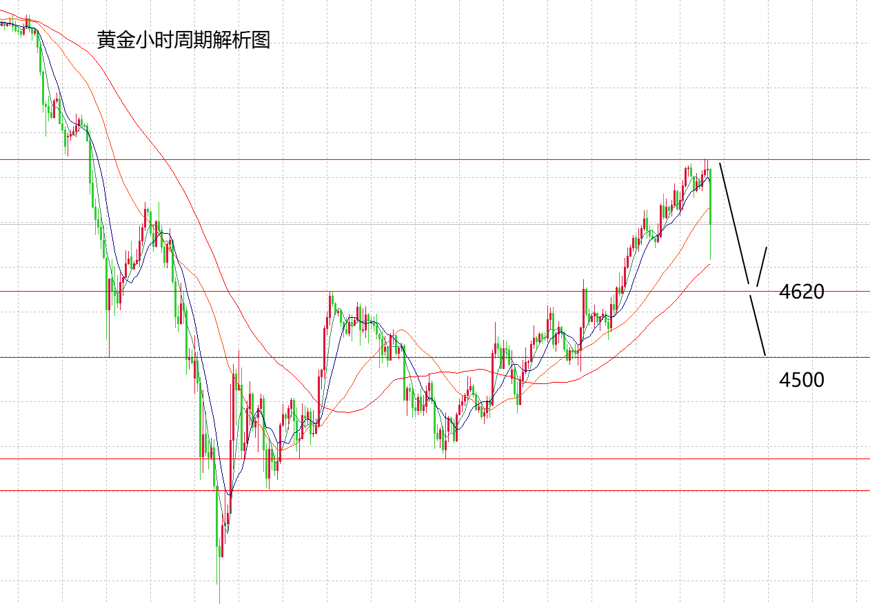 我们来说说上个交易日的行情,本周初就明确提示过大家,这波黄金的上涨空间会给到4735,4820,而实际经过三天的演变,黄金最高目前在4800,走势,力度非常符合山海的预期,而给到4800之上,山海就讲过,不要过分的看涨黄金,要注意市场数据的冲击,是否能带来一定的变化,所以,周三在慢涨中,提示大家不要追高黄金。经过现在早上的大跌,大家也就明白山海的苦口婆心。这波黄金山海从次低点4350开始看涨到4800开始结束,涨跌的节奏变化确定,那么,中期上涨走完,接下来就要进入下跌调整周期,周三ADP数据利空,实际走势是先涨后跌,市场消化有点慢,但其内部影响力还是给出来了,因此,今天的失业金数据也会有助力影响。从技术面来看,日线四连阳,但周三的阳线压制在布林中轨之下,目前的下跌力度非常大,非常快,技术面体现的刚刚好,这里是中期强弱的转换信号,所以,今天日线收阴的概率很大,继续下行的话,可能会回归到4500附近,然后再看本周非农数据影响。H4中期的变化也非常明显,大阴吞阳,均线被打压下来,形成勾头表现,布林收口,一切信号都是走弱的表现,那么,今天确定强弱转换,下方可以逐步看到4620,4500,大家要注意节奏变化。所以,不要觉得周一到周三黄金大涨,就感觉多头趋势来了,实际上,市场变化多端,强弱就在一瞬间。总体来说,本周前三天的上涨走完,现在需要转换思路,看后两天的调整空间,周四,周五黄金高空逐步看下行空间。