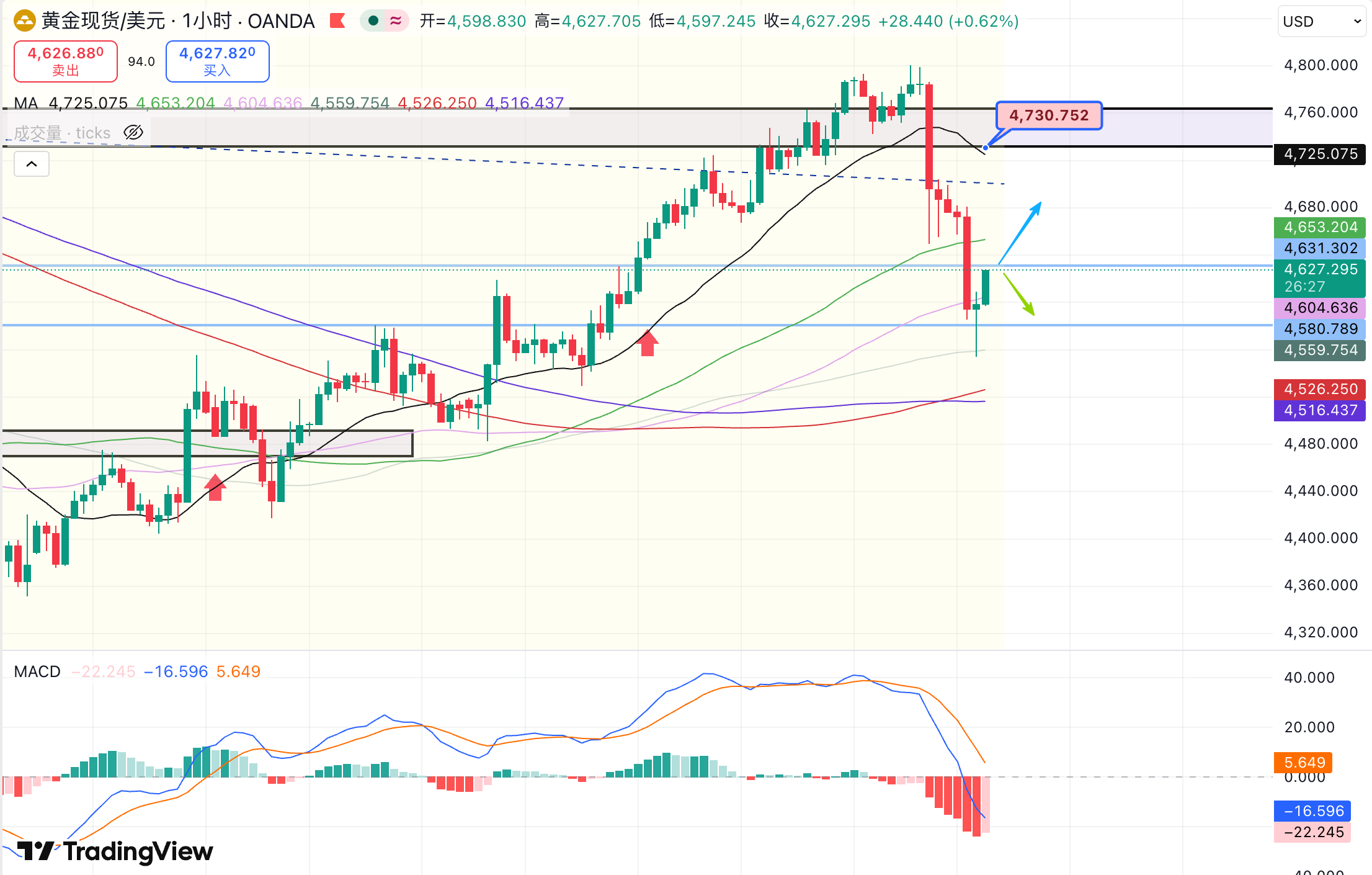 从1小时结构来看,早间行情走出一波快速下跌,价格自高位4760附近一路回落至4600下方,短线情绪明显转弱。目前价格在4600一线企稳反弹,进入修复阶段。