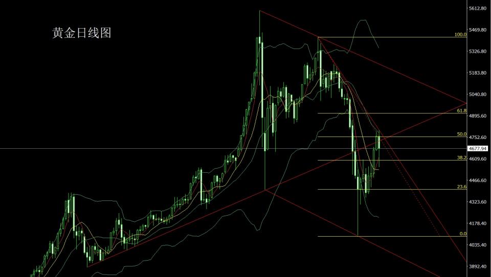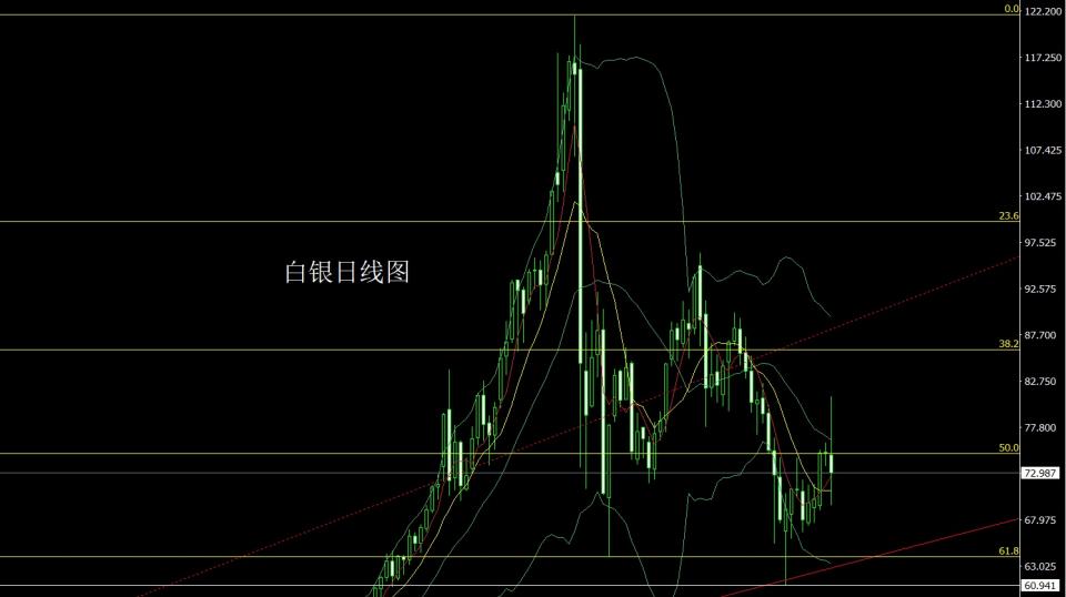 昨日黄金市场早盘开盘在4759的位置后行情先拉升给出4801.3的位置后行情在美国总统讲话和技术上日线级别布林中轨和下降趋势线的压力下强势回落,日线最低给到了4553.8的位置后尾盘强势拉升,日线最终收线在了4677.9的位置后,日线以一根下影线极长的大阴线收线,而这样的形态收尾后,今日的行情回踩还需多,点位上,上周4120的多止损跟进在4400,4310的多减仓后止损跟进在4500,今日的行情4645附近多止损4640,目标看4680和4700和4712和4735.