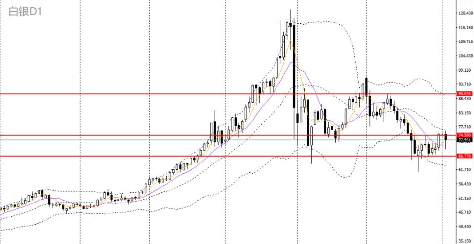 白银昨日收跌,日线RSI位于50左右,4小时回踩70关口附近企稳,仍处于66-76区间内震荡,可维持区间内高抛低吸的思路。