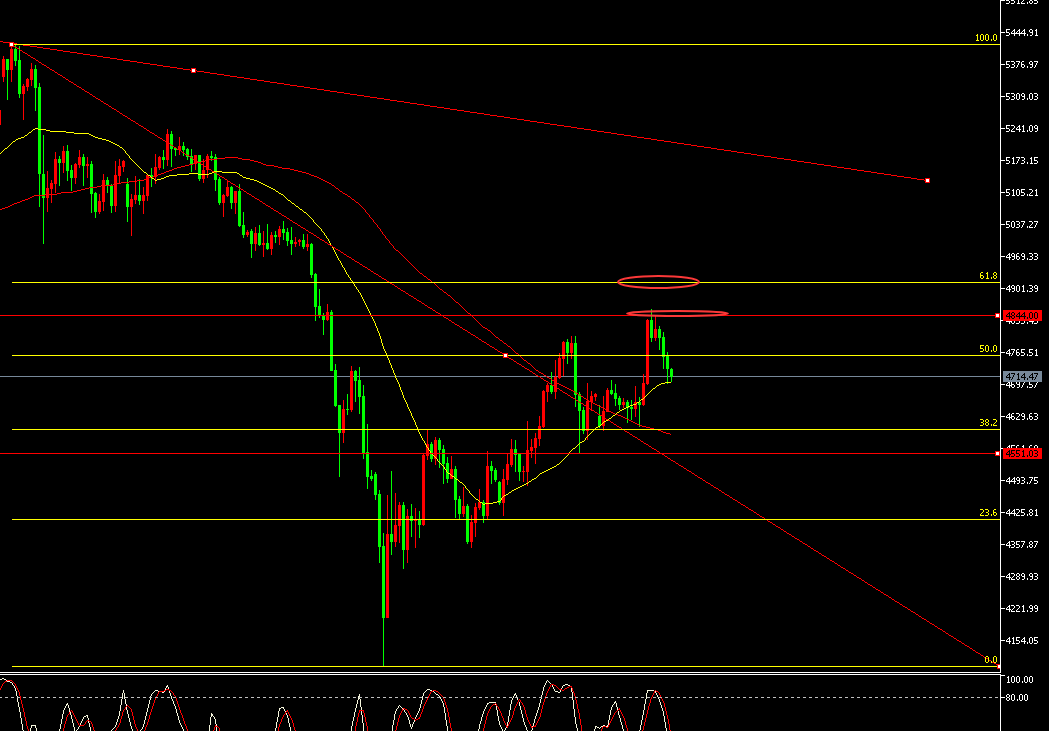 4小时形成了小台阶震荡反弹,连续的试探阻力,一步高一回头的震荡走法,目前连续多次反弹后接近了强阻力区域,以5420下跌浪形至4100的反弹黄金分割点0.618的阻力位置接近,昨日拉升后快速回落,今日仍要留意4870-4910区域的压制。下方关注4546低点破位走弱,结合日线的收低,今日有望转换回落,但节奏仍可能是继续迂回震荡的走法,操作上今日继续围绕4800-4850间分别空防守放在昨日高点即可下方看回4600-4650破位再进一步下看。