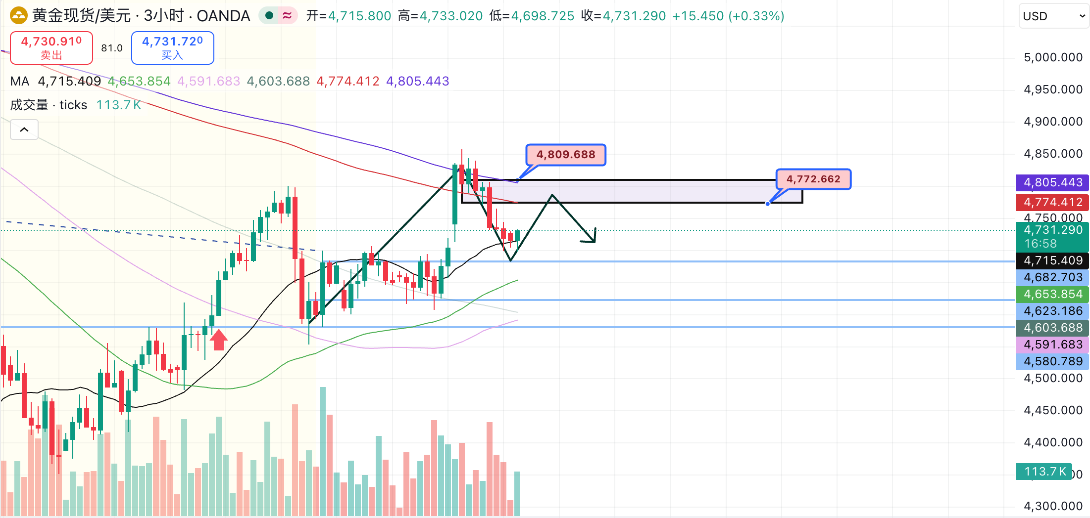 隔夜金价在4810一线遇阻回落,跌破4770后,4730未能有效支撑,价格最低触及4700(1小时MA120)后出现反弹。但当前反抽仍受制于1小时MA20压力,短线预计反弹空间有限,需先消化上方抛压。