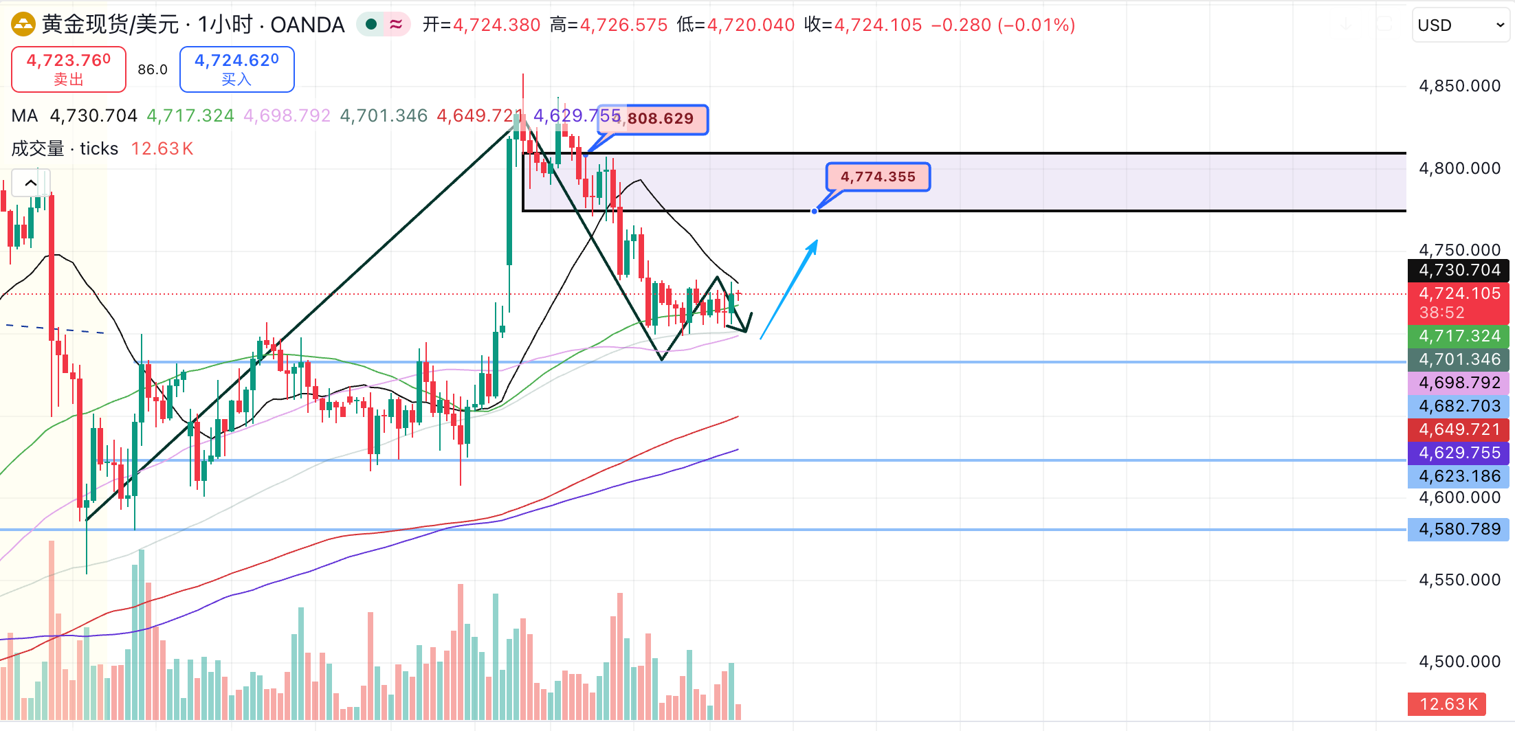 目前周四欧盘初段,黄金价格始终保持在4734-4695的小区间震荡,区间震荡的行情是我擅长的,下午连续交易的三单均取得不低的利润。就当前的行情来说,下方受到1小时89周期均线的支撑,上方的MA20均线偏弱,对金价带来短线上的压力,这也是我们下午三单高空低多生效的根本原因。