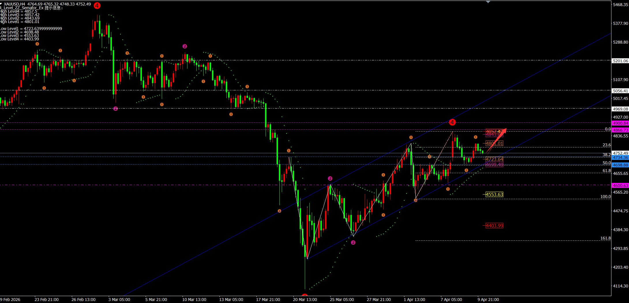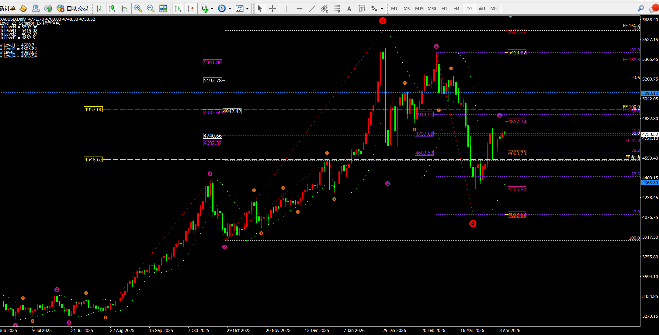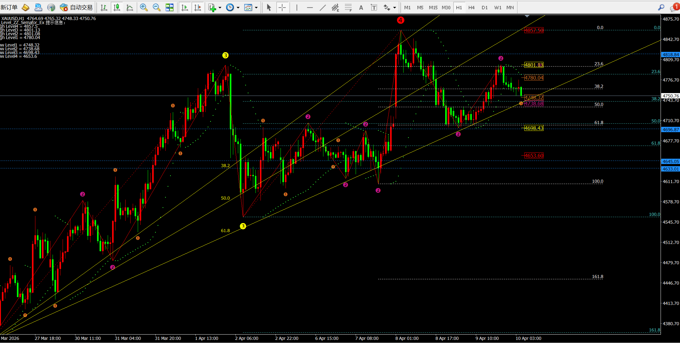 昨日开盘价格从4725-32附近震荡下跌至4698附近反弹4732一线;之后价格就维持在4703-4730区间震荡。欧盘价格上破4732一线到达4760附近并回撤4734-38一线进行二次上涨至日内高点4801一线;我们日内4703-05多单完美收官近100美金;而凌晨价格在4800横盘后回撤至今日的4750一线后目前反弹4780一线。