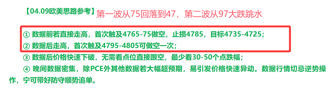 ④ 若数据实际值低于2.9%或者更低,做好跟多准备;重点看数据前价格,在4750下方任意点位均可直接跟多。