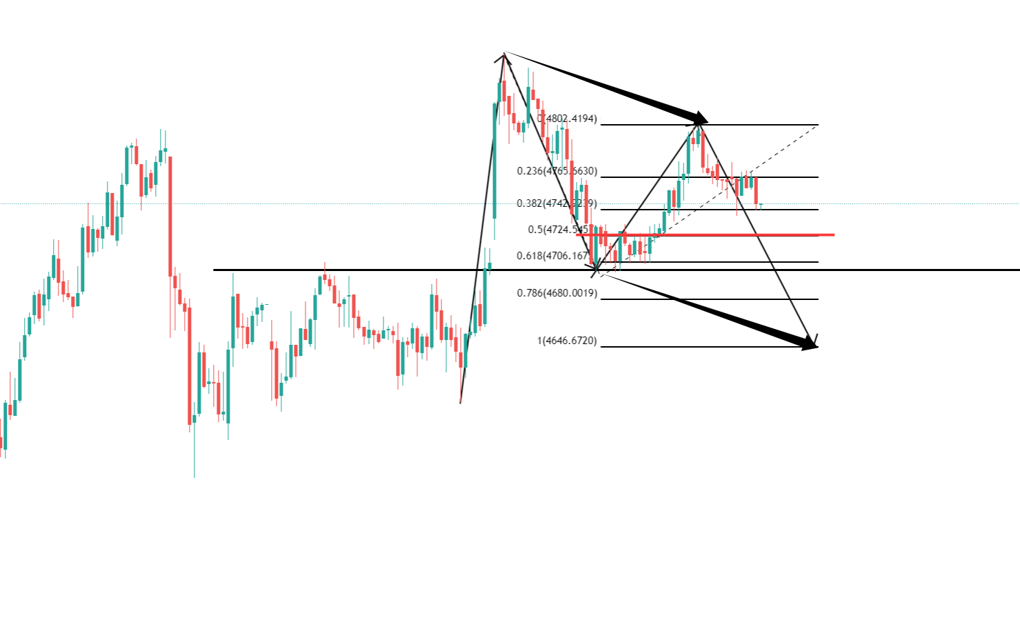要想改变这个条件的话需要什么?当然是看变盘可能性,看涨的买点就在4723,这里到位后我会直接介入,你可以看图如果一个拓展序列50%和61.8%的回撤都被破位,那这行情就没有看什么反转的必要了,老实认当前走势即可,也就是说,4723参与,进场后防守给到4700完事,你要是能撑住这个百元大关和昨天的起涨支撑,那看到4800的利润不是什么问题,关键是白盘的压跌,只要能给到机会是最好,我最怕的莫过于不给机会,然后晚上开始持续反弹上涨,那就只有等待4800破位追涨,看个30美金跑路,这也不错,就看它怎么走,别问我怎么不拿到4900,国内黄金的肯定要拿,我做国际的持仓过什么周末?