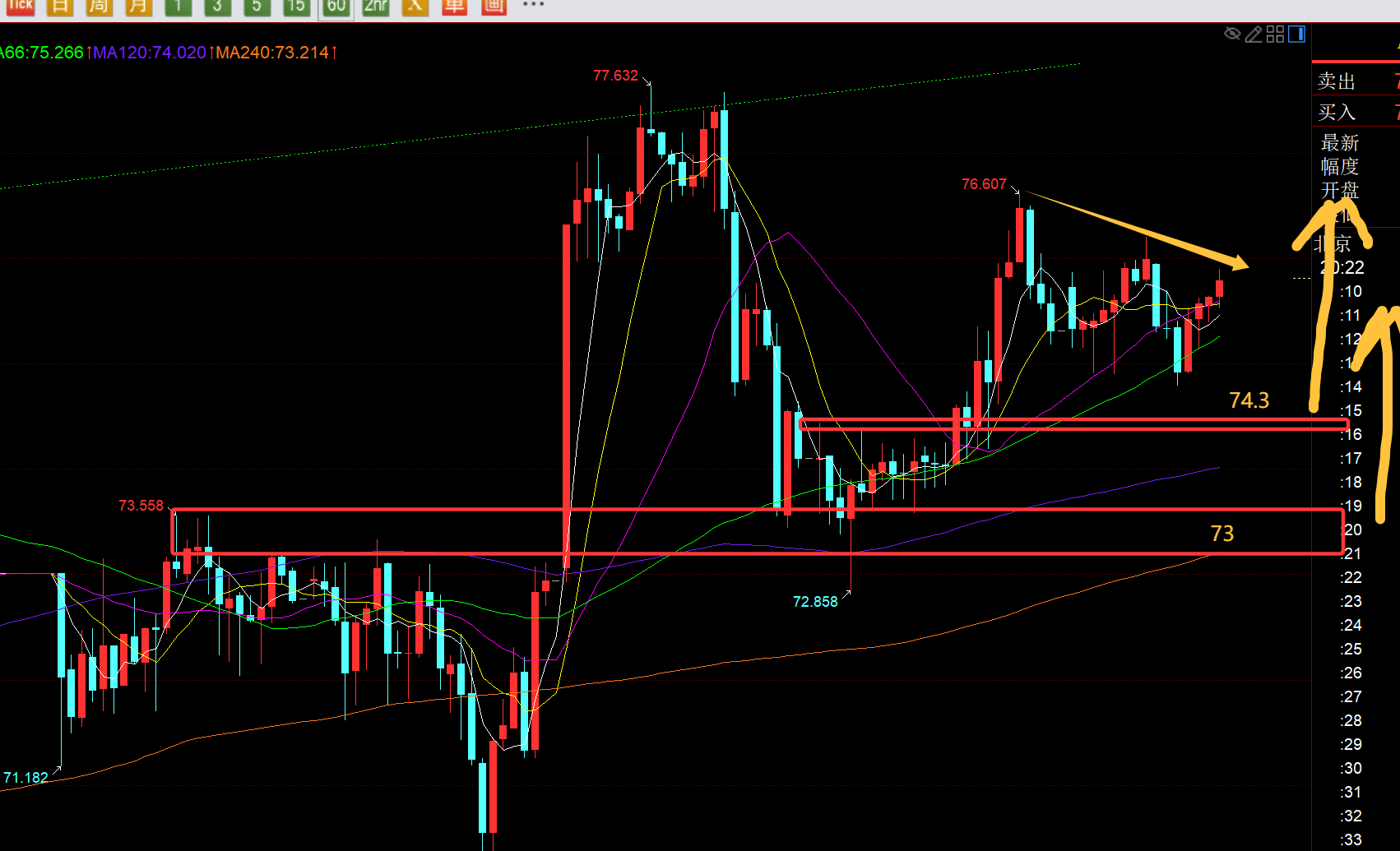 白银方面:从图中分布看,当前黄色阻力线承压,一旦突破站上,则会再试探隔夜76.6高点,甚至冲击77.6及上; 支撑留意74.3和73两个顶底企稳;