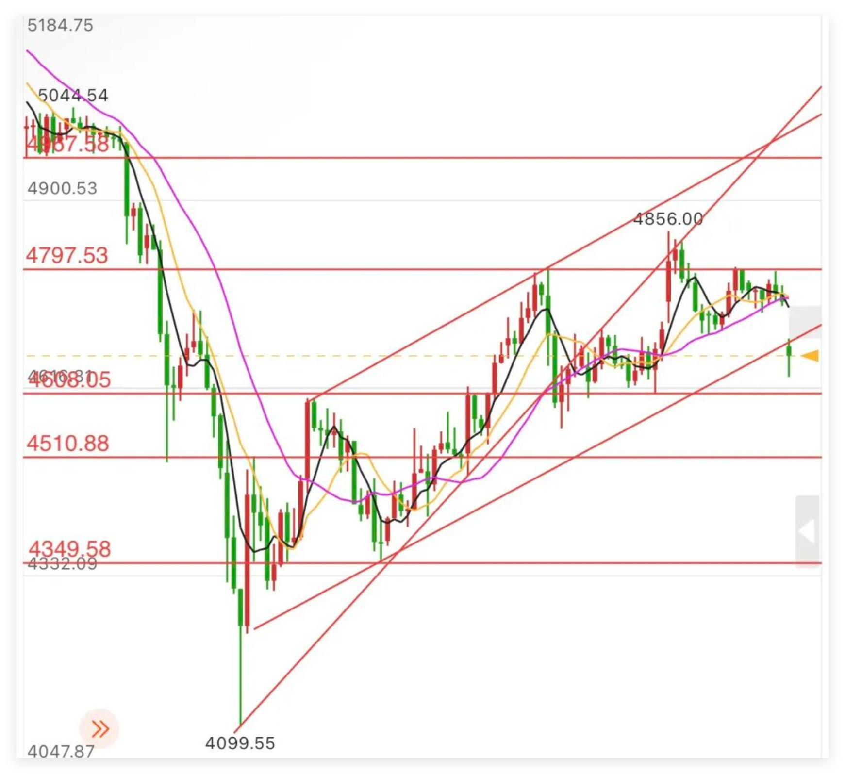 国际黄金行情,上周黄金整体震荡,大跌后反弹周线三连阳;周末视频说了,本周第四周,相对很关键。4100止跌以来,目前反弹最高4856美元,刺破5周线,10周线压制明显。上周四及周五更是明显承压4800美元大关。