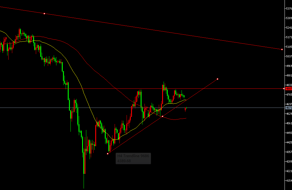 4小时图上周连续在48504800横向整理承压,本周低开。下破了反弹通道上升趋势线。4小时图步入迂回震荡,短线有转弱回调迹象,当然节奏依旧是缓慢迂回式的,并不是单边,边整理边拉动指标的走法。今日操作仍依托4800做为防守继续看空即可。亚盘反弹4700-4720附近短空防守4735.50目标下看4600-4550破位进一步下看。