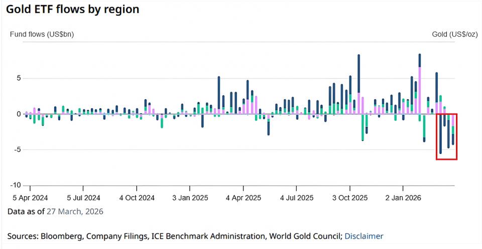 根据最新数据,截至3月27日当周,全球黄金ETF再次录得43亿美元的净流出,这是历史上单周流出规模第二大的一周(仅次于前一周的46亿美元)。