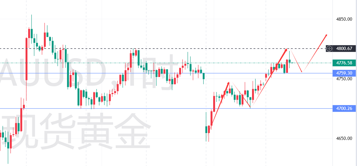 技术面解析:日线级别来看,金价延续中期上行趋势,昨日收出长下影阳线完成V型反转,今日继续收阳攀升,形成两连阳走势,彻底回补周一早盘跳空缺口,多头力量占据绝对主导。当前金价稳稳站稳5日、10日、20日均线之上,均线系统呈现标准多头排列,各周期均线同步向上拐头,MA5均线支撑上移至4745美元附近,MA10均线支撑在4715美元附近,形成层层递进的支撑体系。附图指标MACD快慢线在0轴上方金叉发散,红色动能柱持续增量,多头动能稳步释放;KDJ指标从中高位进一步向上运行,尚未进入极端超买区间;RSI指标维持在强势区间,布林带轨道开口向上扩张,金价紧贴布林带上轨运行,整体趋势单边偏强,仅存在小幅技术性回调需求,无实质性空头反转信号,短期重点关注4800美元整数关口的突破情况。