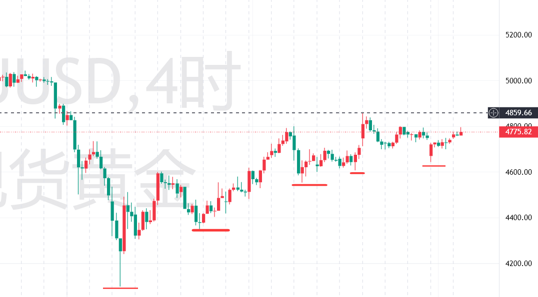 四小时级别来看,金价走出标准的上升通道行情,低点从4644美元逐步抬升至4750美元,高点同步上移至4795美元,波段多头走势极为清晰,每次回踩通道下轨都能快速获得买盘支撑反弹,属于典型的强势多头格局。均线系统呈多头发散态势,MA5、MA10、MA20均线同步上行,成为金价回调过程中的强力支撑,布林带中轨持续向上运行,牢牢托住金价走势,布林带上轨逐步上移,为金价上行打开空间。附图指标MACD在0轴上方保持金叉,动能柱放量平稳,无顶背离信号,上涨走势健康;KDJ指标在中高位区间震荡调整后再度拐头向上,调整过后多头二次发力,推动金价突破前期日内高点;RSI指标站稳50上方强势区间,未触及极端超买线,金价仍有进一步冲高空间,短线重点关注4795-4800区间的压力测试情况,以及通道下轨4750美元附近的支撑有效性。