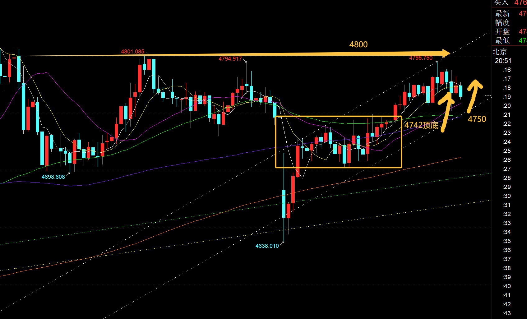 第二,黄金小时线级别:从上图最新通道分布看,昨日以及今日围绕白色上行通道内在发展,下轨支撑今晚上移4750一线,同时今日的起涨点是4742,刚好也是昨日黄色区间整理的上轨,顶底位置,也处于4700-4796的50%回踩分割点,61.8%是4736,属于极限偏强回测点; 因此,今晚4750-4742-4736都存在支撑,向上延续震荡反弹,阻力反复测试4800,拿下有效站稳之后,再往4857、4900、5000等试探;