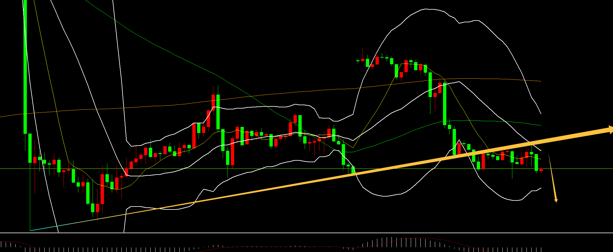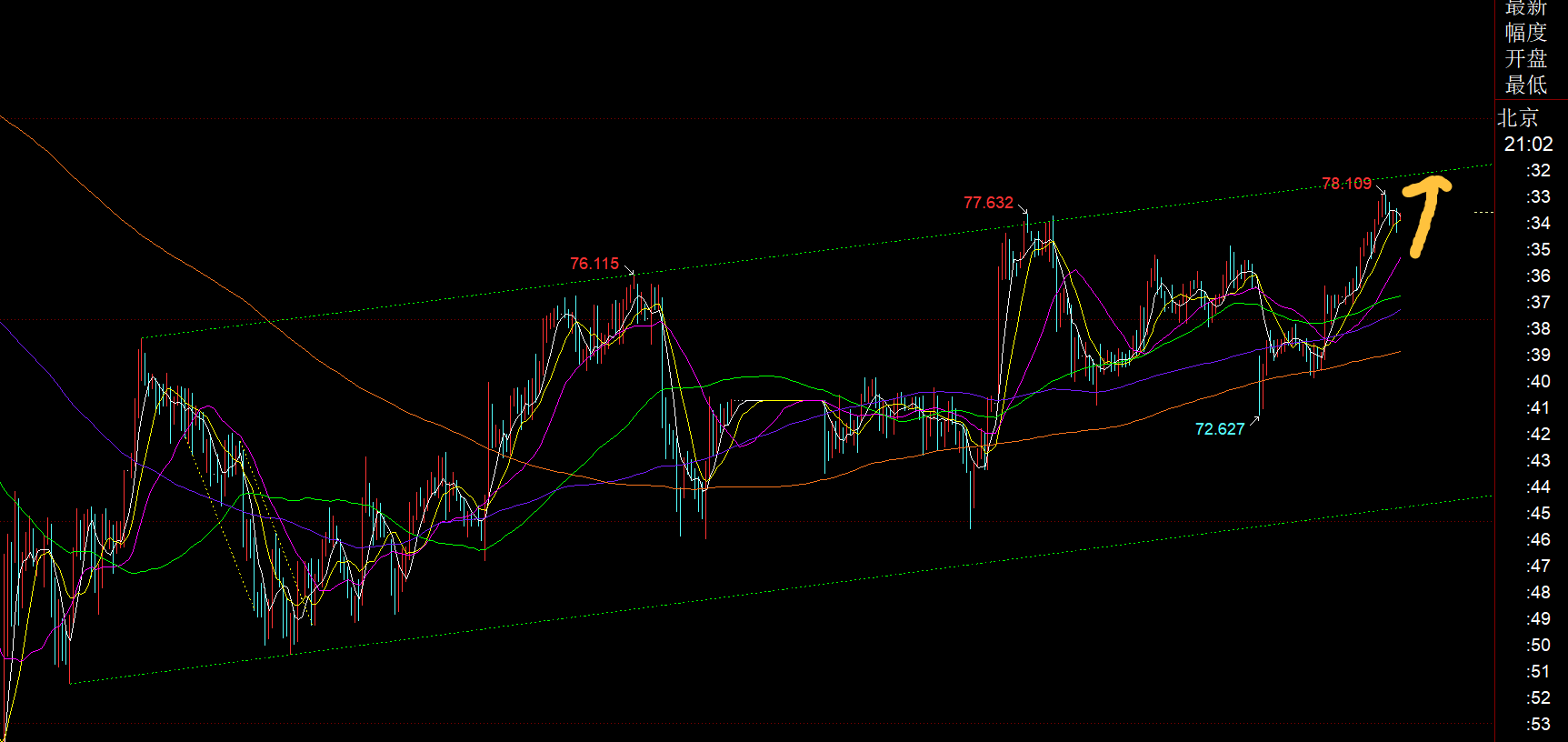 白银方面:白银也再次欲测试图中绿色通道上轨,这是第四次,测试的次数越多,最终容易上破;今晚支撑关注77-76.8顶底位置上,继续向上反弹,上轨阻力是78.5-78.9,一旦突破站上,就往82-85去试探;