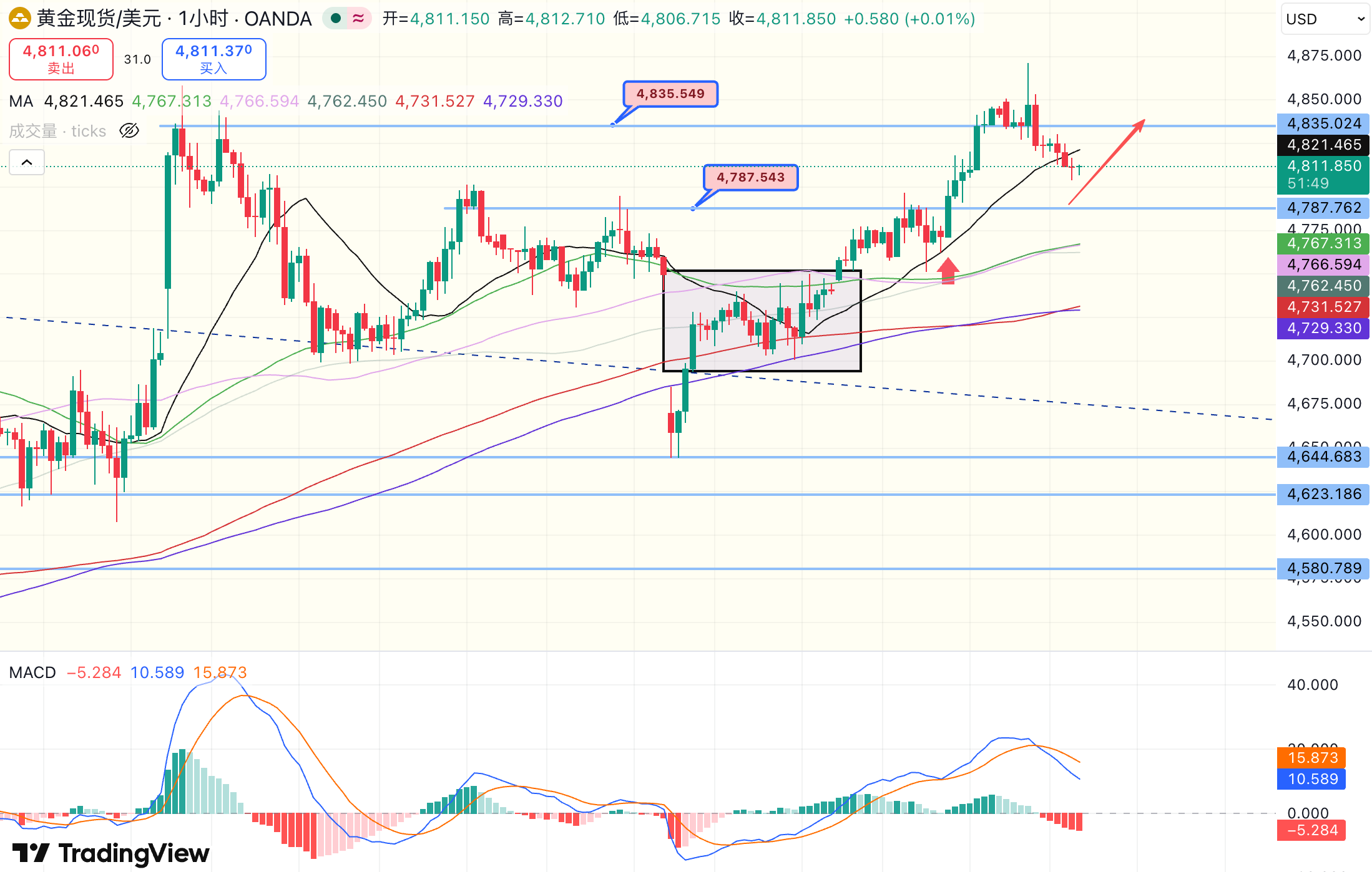 一如我们早上的分析,金价在刺破4小时MA200周期均线后震荡回落,目前欧市早盘,价格已经跌至该级别120周期均线以下(现报4807),我们早上说理想的做多位置在4787,而在此之前,4795可能成为备选点位(2小时MA20均线)。