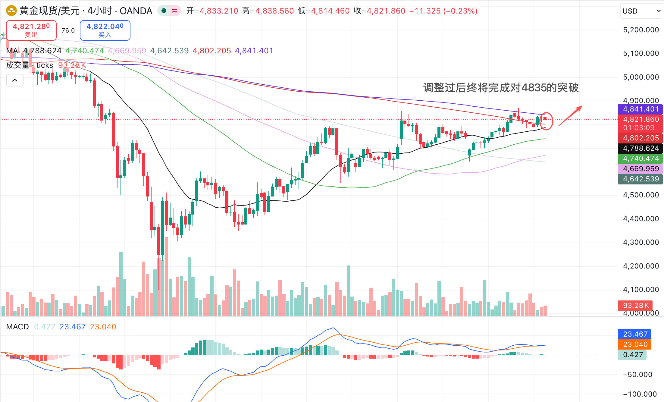 自周二(14日)亚盘以来,金价始终运行在4小时MA20均线之上,多头结构保持完好。周三亚盘虽一度刺破200周期均线(4842),但很快回落并重新站稳MA20(4789),说明下方承接力度依旧存在,回调更多是技术性修正,而非趋势转弱。