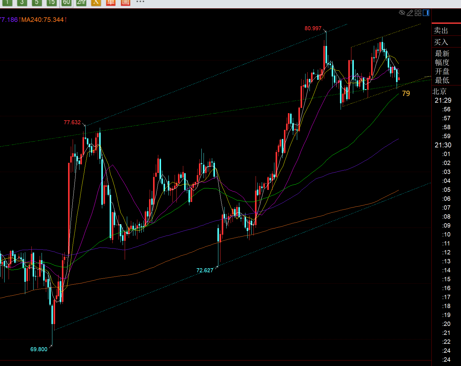 白银方面: 从图中通道看,前期的绿色通道上轨已有所突破站上,只是暂时还未直接发力,又陷入了黄色通道内,下轨支撑79附近,上轨阻力81,这是今晚的运行区间;