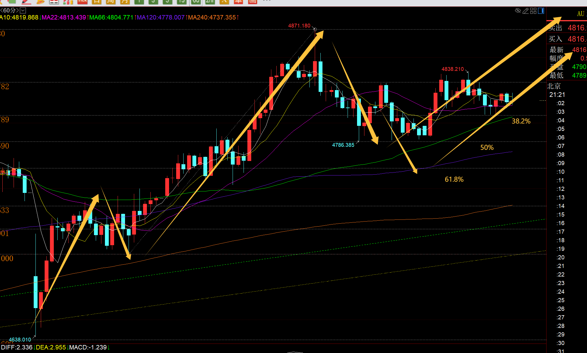 第三,黄金小时线级别:从图中分割看,这两日基本卡着分割位置进行横盘,昨日是236和50分割之间,今日是236和382分割之间,波幅是昨日的一半,相对墨迹;因此4830一线这个236分割阻力依然是关键承压点,只有小时线连续两个小时收盘一直处于上方,那么才有动能去冲破4874,延续第五浪的拉升;因此,支撑就是三个位置关注,4805-06是382分割位置,4786是50分割位置,极限4765是618分割位置,每一个分割位置都具备企稳支撑作用;
